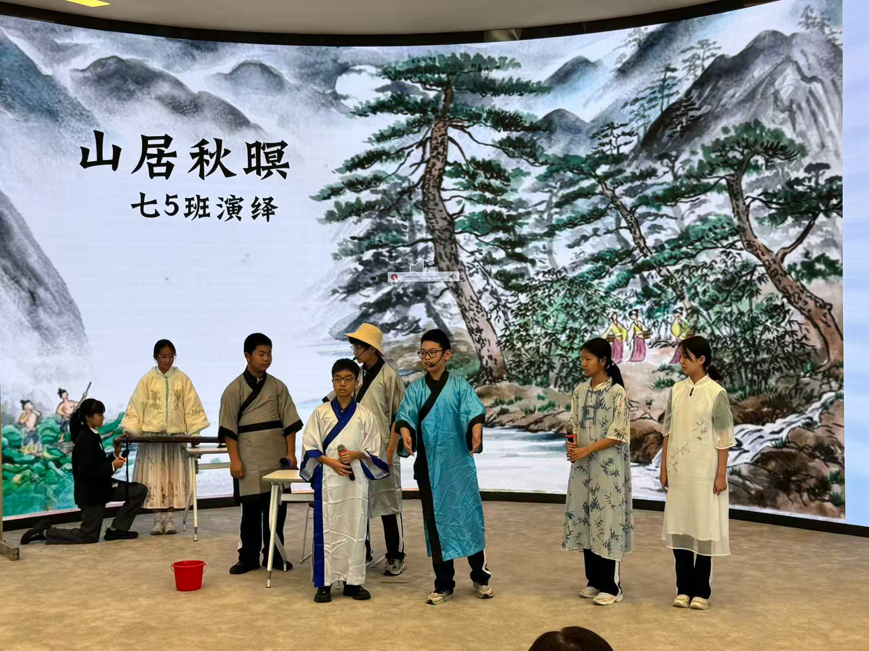 秋日主题演绎同样精彩。七(11)班诠释《秋天的怀念》中 “好好活儿”的深沉牵挂;七(5)班演绎《山居秋暝》,勾勒出 “空山新雨后”的空灵画卷;七(6)班与七(3)班联合编排《秋词》,以“晴空一鹤排云上”的壮阔打破秋日萧瑟刻板印象;七(12)班以现代演唱形式演绎《天净沙・秋思》,让千年乡愁焕发新活力。