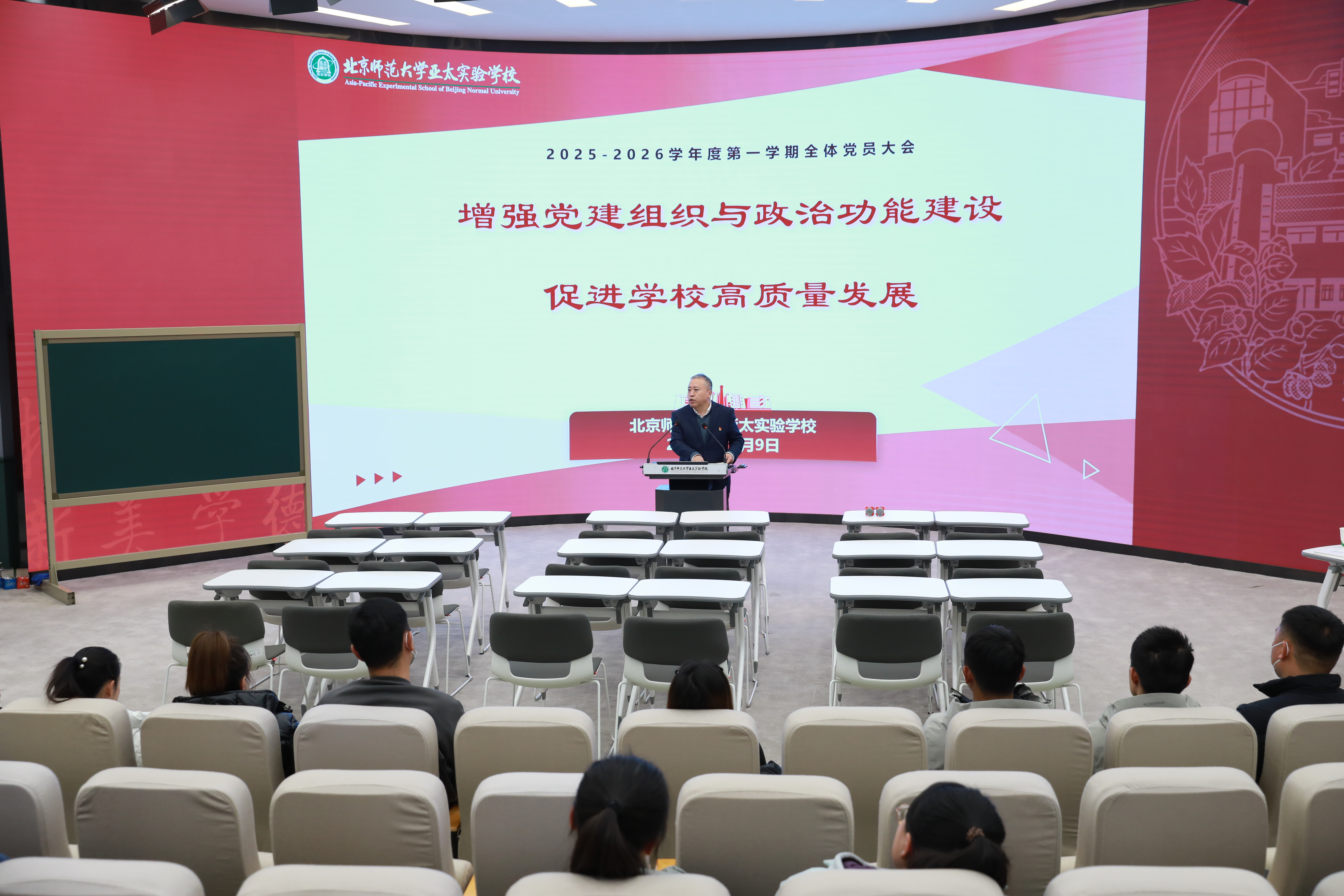 为深入学习贯彻习近平新时代中国特色社会主义思想,进一步增强学校党组织的政治功能和组织功能,切实以高质量党建引领学校高质量发展,2025年12月9日,中国共产党北京师范大学亚太实验学校委员会召开“增强党建组织与政治功能建设,促进学校高质量发展”主题党员大会。
